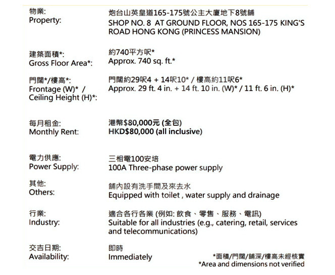 *面積/門闊/舖深/樓高未經核實 *Area and dimensions not verified